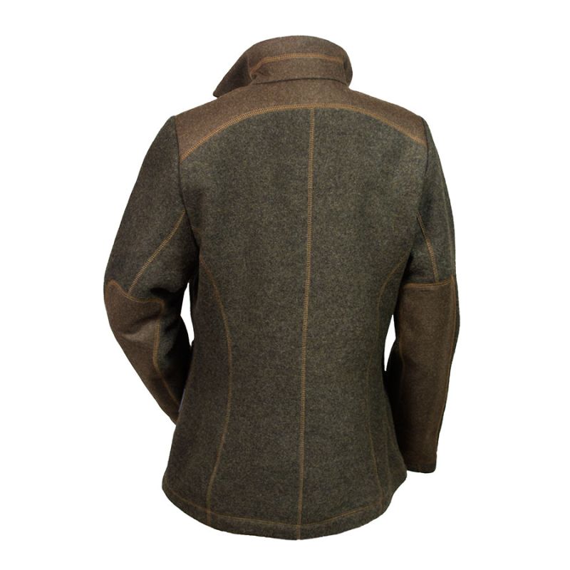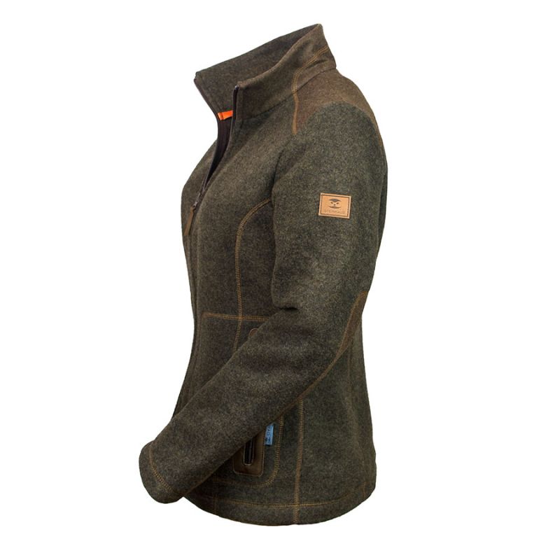 Meleg és jól szellőző női lodenfleece kabát puha, 100% tiszta gyapjúból, állógallérral és elegáns bőr részletekkel a zsebeknél. A doubleface anyag kellemes meleget és jó szélvédelmet biztosít.